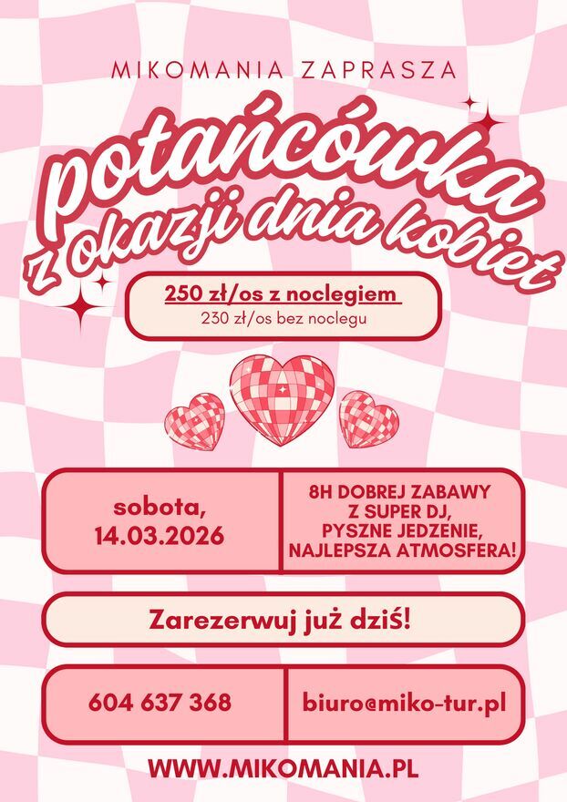 Zapraszamy do Mikomani – miejsca, gdzie wyjątkowa atmosfera spotyka się z ciszą i naturą Borów Tucholskich. To idealna przestrzeń, aby na chwilę zwolnić, oderwać się od codzienności i świętować Dzień Kobiet dokładnie tak, jak lubisz.Potańcówka z okazji Dnia Kobiet
